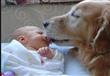 كلب يغطي طفل رضيع نائم