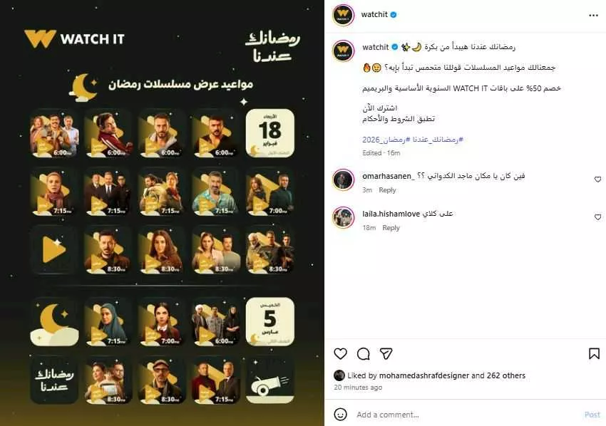 نشرت الصفحة الرسمية لـ "Watch It" على انستجرام، صورة تضمنت المسلسلات المقرر عرضها عبر المنصة ومواعيد عرضها.