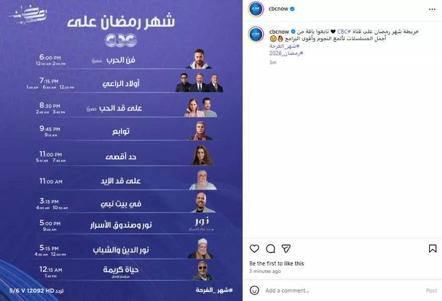 نشرت الصفحة الرسمية لقناة "CBC" على انستجرام، صورة تضمنت عدد من المسلسلات والبرامج التلفزيونية المقرر عرضها طوال شهر رمضان.