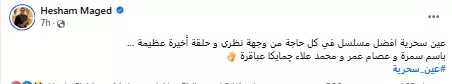 وكشف هشام ماجد، رأيه بالمسلسل، عبر صفحته على "فيسبوك"، قائلا: "عين سحرية أفضل مسلسل في كل حاجة من وجهة نظري وحلقة أخيرة عظيمة، باسم سمرة وعصام عمر ومحمد علاء چمايكا عباقرة".