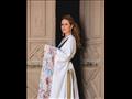 ارتدت عباءة باللون الأبيض، تشبه الأزياء الهندية، مزينة بالنقوشات والتطريزات باللون الذهبى من الأمام، وأكملت الإطلالة باعتماد أقراط طويلة ضخمة بنفس لون التطريزات، مع لف الطرحة بطريقة التربون.