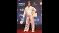 ظهرت مرتدية بدلة من الساتان باللون النيود، بجاكت طويل، مع قميص باللون الأبيض، ونسقت مع الإطلالة شابوه باللون الذهبي النحاسي، مع كلاتش من اللؤلؤ.