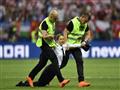 ودخل الأشخاص في الدقيقة 52 من المباراة إلى أرض ملعب لوزينكي بالعاصمة الروسية، مرتدين زيا يشبه ملابس الشرطة.