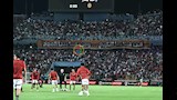 بينما حرصت الجماهير المتواجدة في المدرجات على رفع لافتات موجهين رسالة إلى اللاعبين، مضمونها: "من هنا بدأ التاريخ، ومن هنا يبدأ المجد".