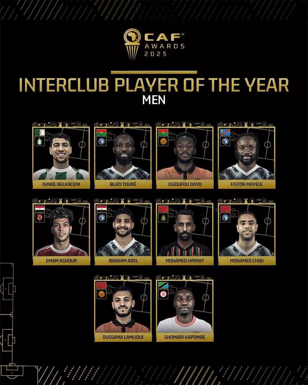 أعلن الاتحاد الأفريقي لكرة القدم "كاف"، قائمة اللاعبين المرشحين لجائزة أفضل لاعب في أفريقيا (رجال).