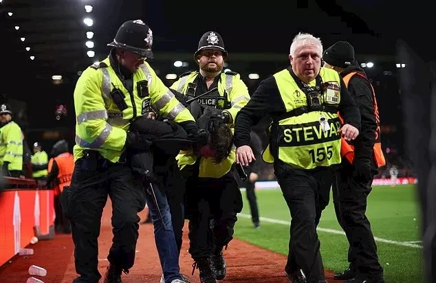 مع تسجيل مالين لهدفه الثاني في الدقيقة 41، اشتدت أعمال الشغب، حيث استمرت الجماهير في رمي المقذوفات والصواريخ، ما اضطر قائد يانج بويز لوريس بينيتو للتدخل ونداء لاعبيه للتهدئة، لكن الموقف تدهور واندلعت اشتباكات بين الجماهير والشرطة، ما أدى إلى طرد بعض المتشددين وإبعادهم بالقوة من الملعب.