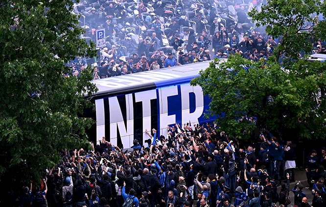 وامتلأت الساحات المحيطة بالملعب بعشرات الآلاف من مشجعي الإنتر، الذين التفّوا حول حافلة الفريق عند وصولها إلى الملعب، في مشهد تشتعل الشماريخ ورفع الأعلام والتيشيرتات الزرقاء، تعبيرًا عن دعمهم الكبير للفريق في هذه المواجهة المرتقبة.