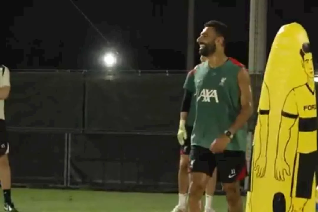 وظهر محمد صلاح خلال مقطع فيديو نشرته حسابات نادي ليفربول عبر مواقع التواصل الاجتماعي مدته 14 ثانية وهو يسجل هدفين غير معتادين له أحدهما بـ "الكعب" والآخر بـ "الرأس".