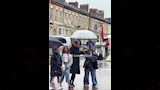 وظهر في الفيديو زوجة محمد صلاح برفقة طفليه "مكة" و"كيان"، بينما كانت سيدتان تمسكان مظلتين لحمايتهم من الأمطار.