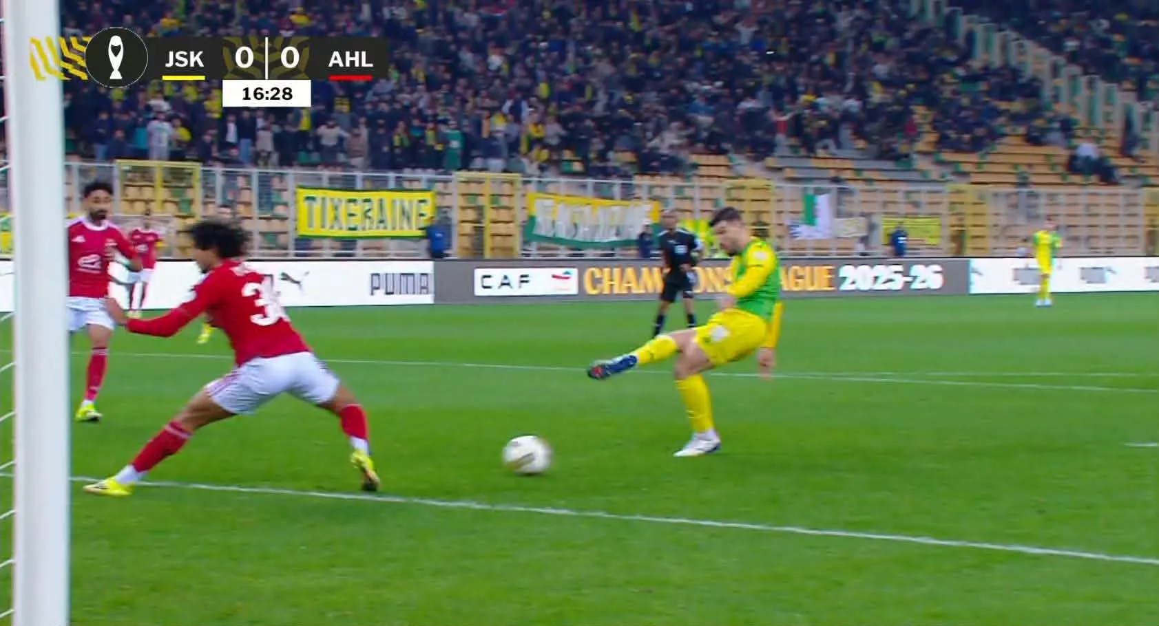 الدقيقة 20: تسديدة صاروخية من شبيبة القبائل تأتي قي قائم مرمى النادي الأهلي.