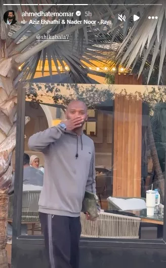 وظهر شيكابالا في الفيديو، الذي نشره عبر خاصية "الستوري"، أثناء وجوده مع أحمد حاتم، حيث قام أحمد حاتم بتصويره دون أن ينتبه، لانشغاله بالتقاط صورة مع طفل، وعندما انتبه شيكابالا لعملية التصوير، مازحه وأرسل له قبلة في الهواء.