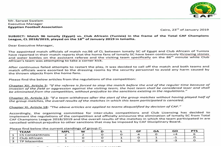 ونشر الحساب الرسمي للاتحاد الأفريقي لكرة القدم، أن لجنة الأندية، قررت استبعاد الإسماعيلي من دوري أبطال أفريقيا نسخة 2019، وإلغاء نتائج المباريات التي خاضها الفريق أمام مازيمبي الكونغولي والإفريقي التونسي.