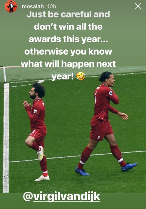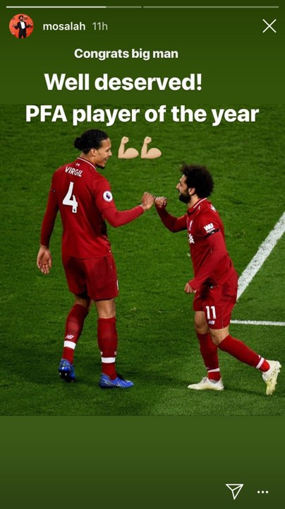 ونشر صلاح صور تجمعه بفان دايك من خلال حسابه الرسمي على "انستجرام" وعلق قائلا "لاعب العام عن جدارة واستحقاق".