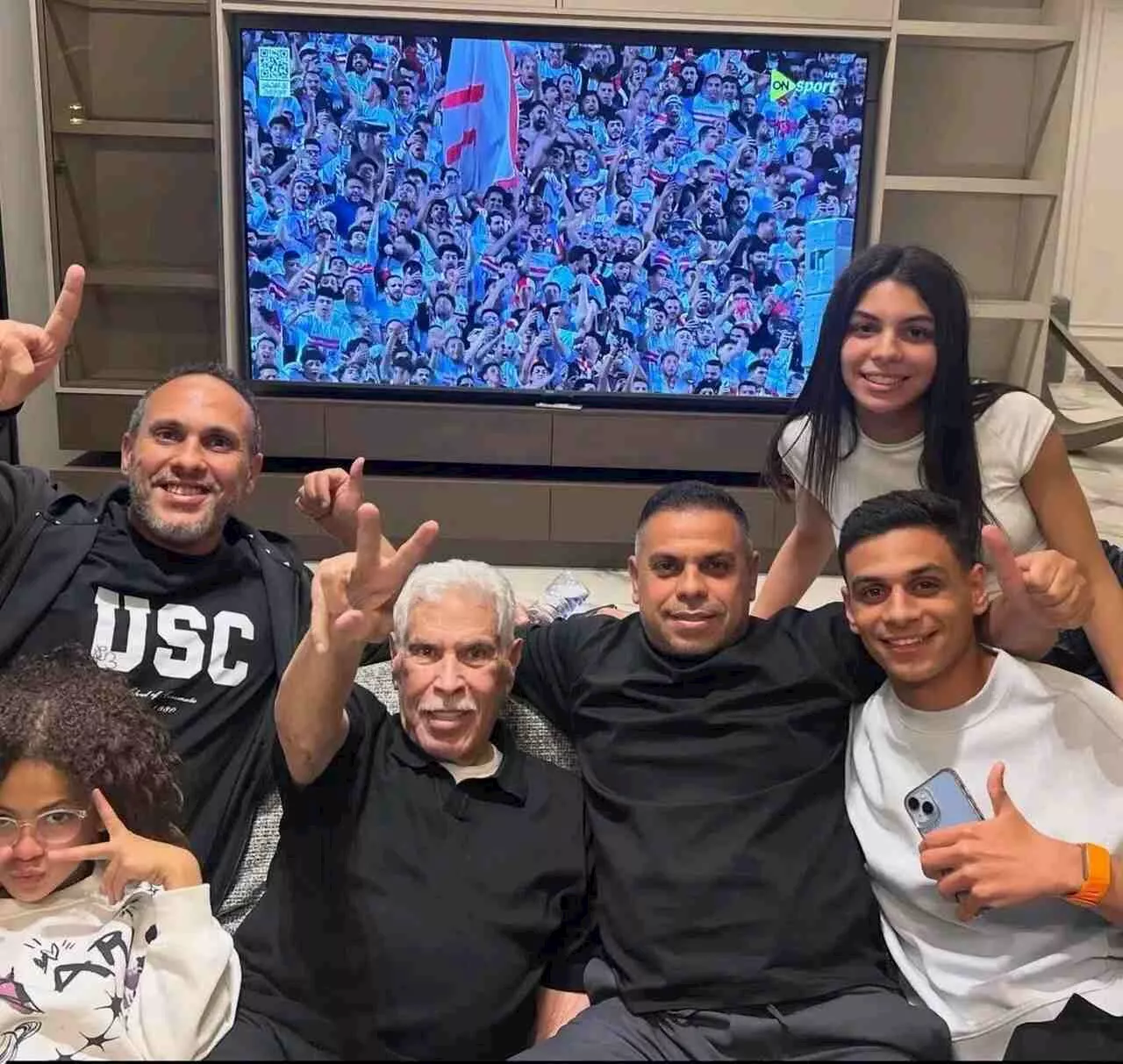 ونشر كريم حسن شحاتة عبر حسابه على موقع تبادل الصور والفيديوهات "إنستجرام" صورة لحسن شحاتة معه وأحفاده خلف شاشة التلفاز مع علامة النصر، معلقاً:"مبروك ماتش بيراميدز".
